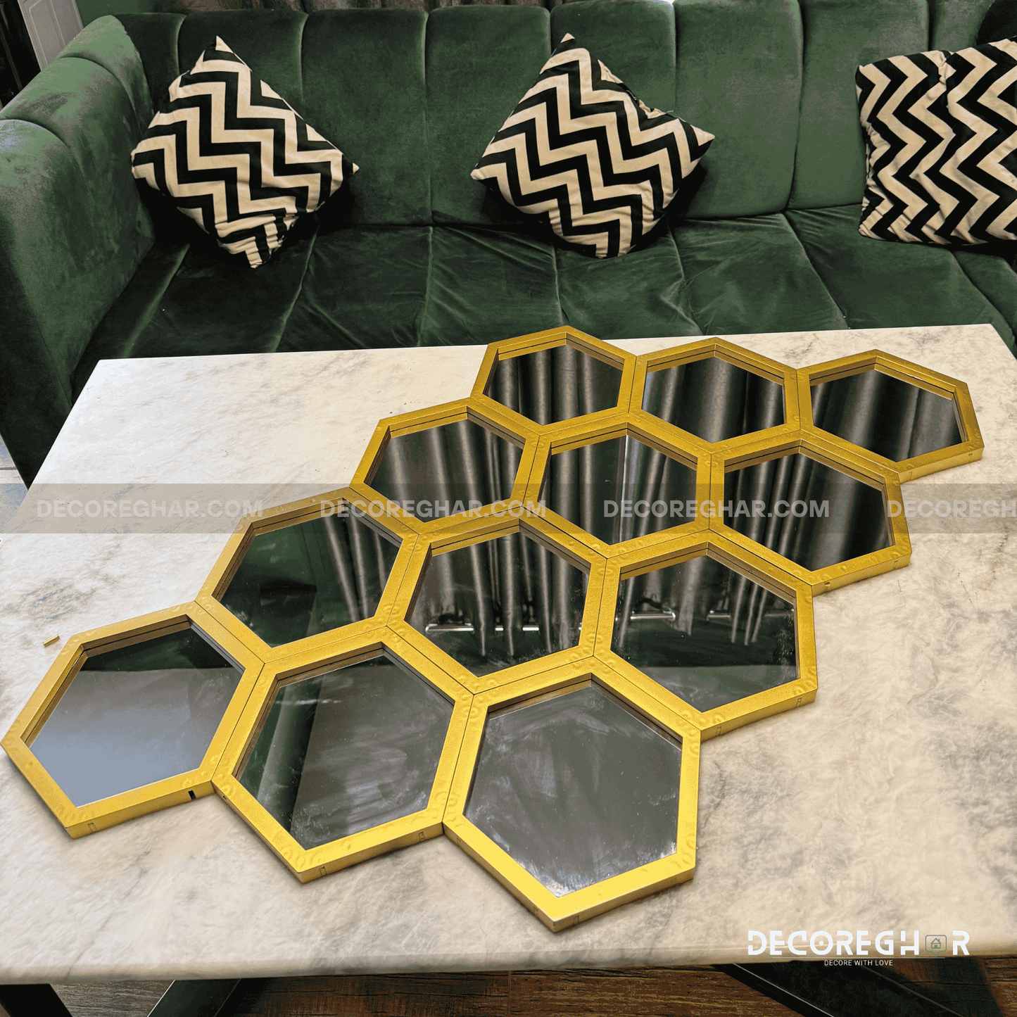 Elevate your home décor with this stunning hexagonal honeycomb wall mirror. Featuring six interconnected hexagon mirrors with a sleek gold frame, this piece adds a touch of elegance and modern sophistication to any room. Perfect for living rooms, hallways, or bedrooms, it reflects light beautifully while doubling as a unique wall art statement. Easy to hang and versatile, this mirror blends seamlessly with both contemporary and classic interiors.